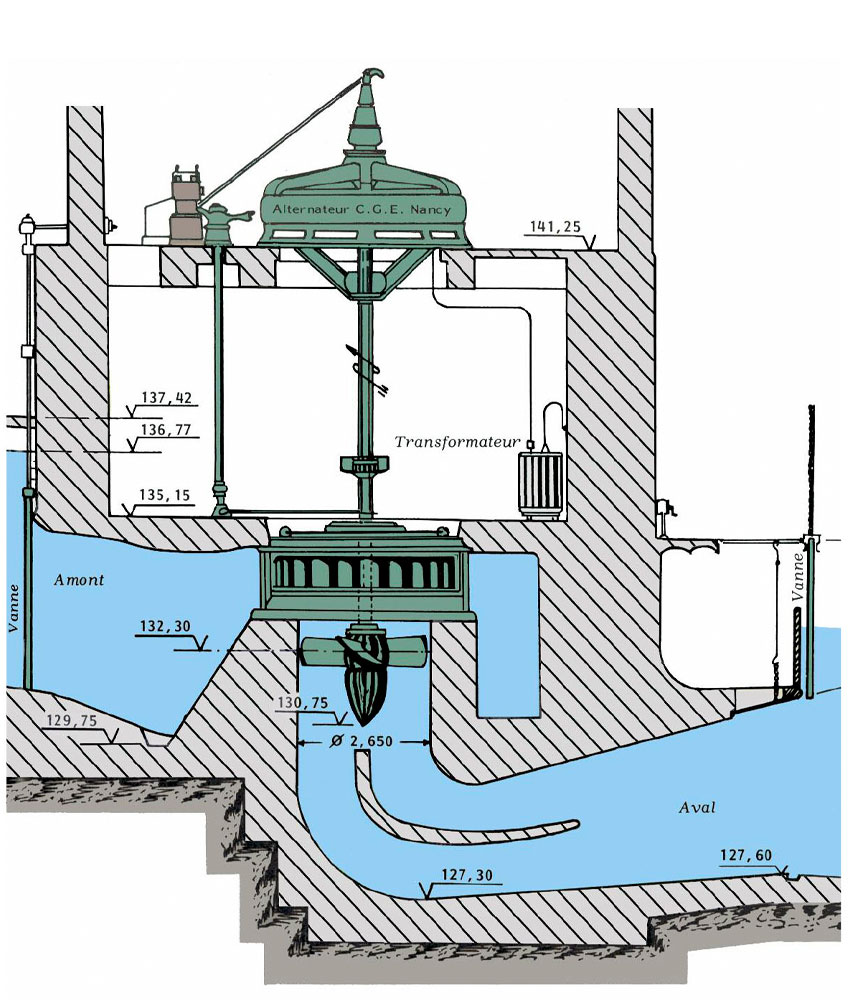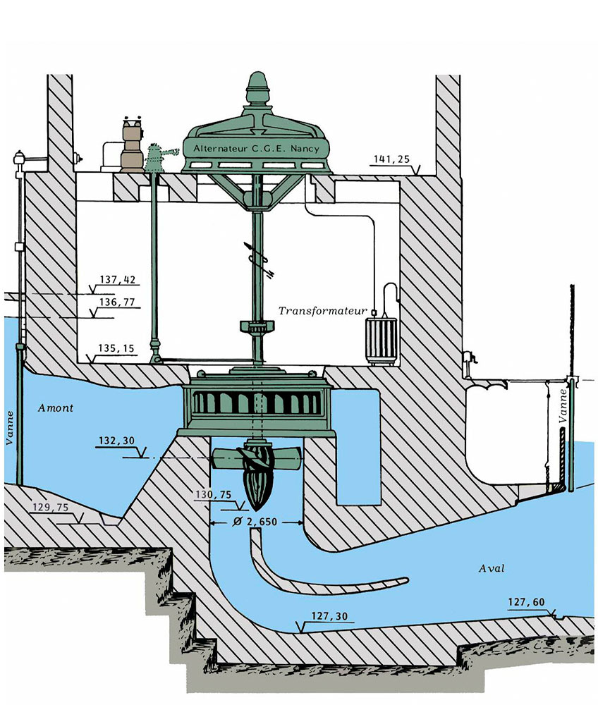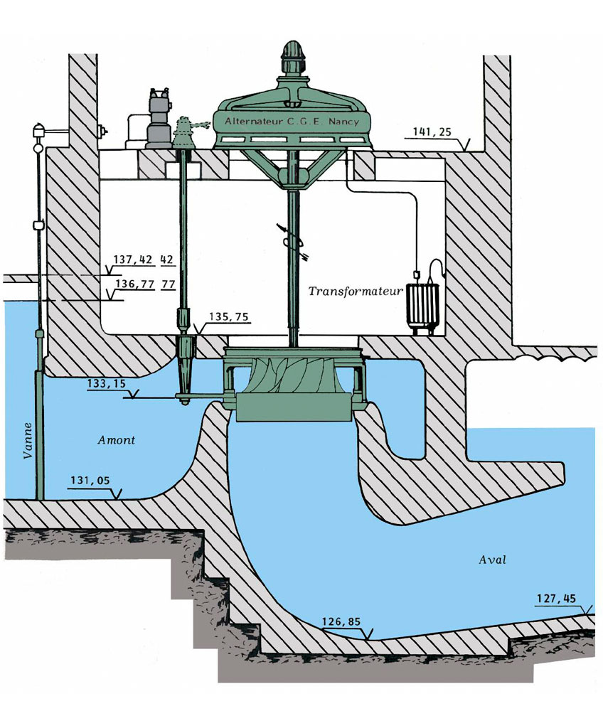 • 3 turbines Francis, 3 turbines Kaplan, 2 groupes bulbes