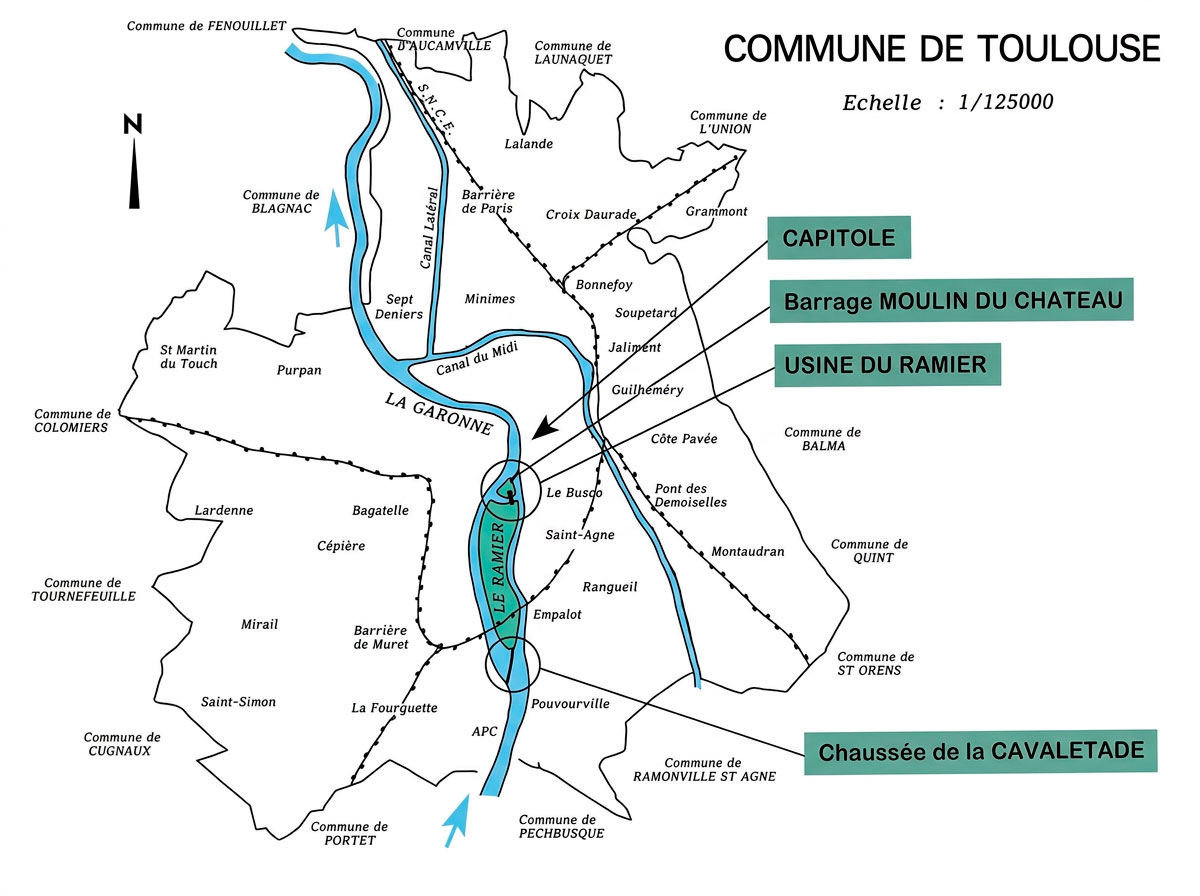 La Régie Municipale d’Électricité de Toulouse exploite deux centrales hydroélectriques situées sur la Garonne : l’usine du Ramier et la centrale de la Cavaletade. Ces installations permettent de produire une énergie renouvelable locale, avec une puissance installée de 5,4 MW et une production annuelle d’environ 22 GWh.