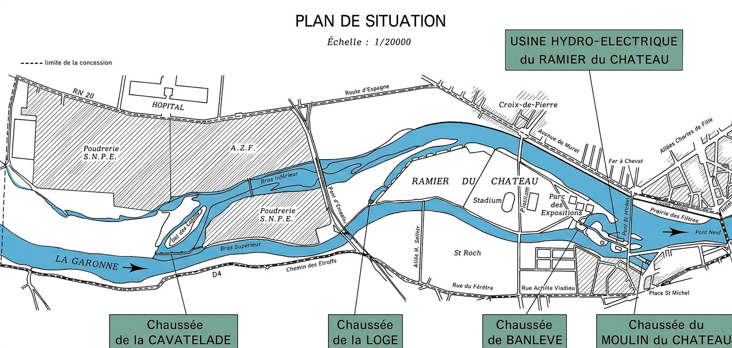 Construite entre 1917 et 1922, l’usine du Ramier constitue le site historique de production. Elle est équipée de plusieurs types de turbines adaptées aux variations de débit du fleuve. Mise en service en 2014, la centrale de la Cavaletade complète ce dispositif avec des équipements modernes optimisés pour les faibles chutes.